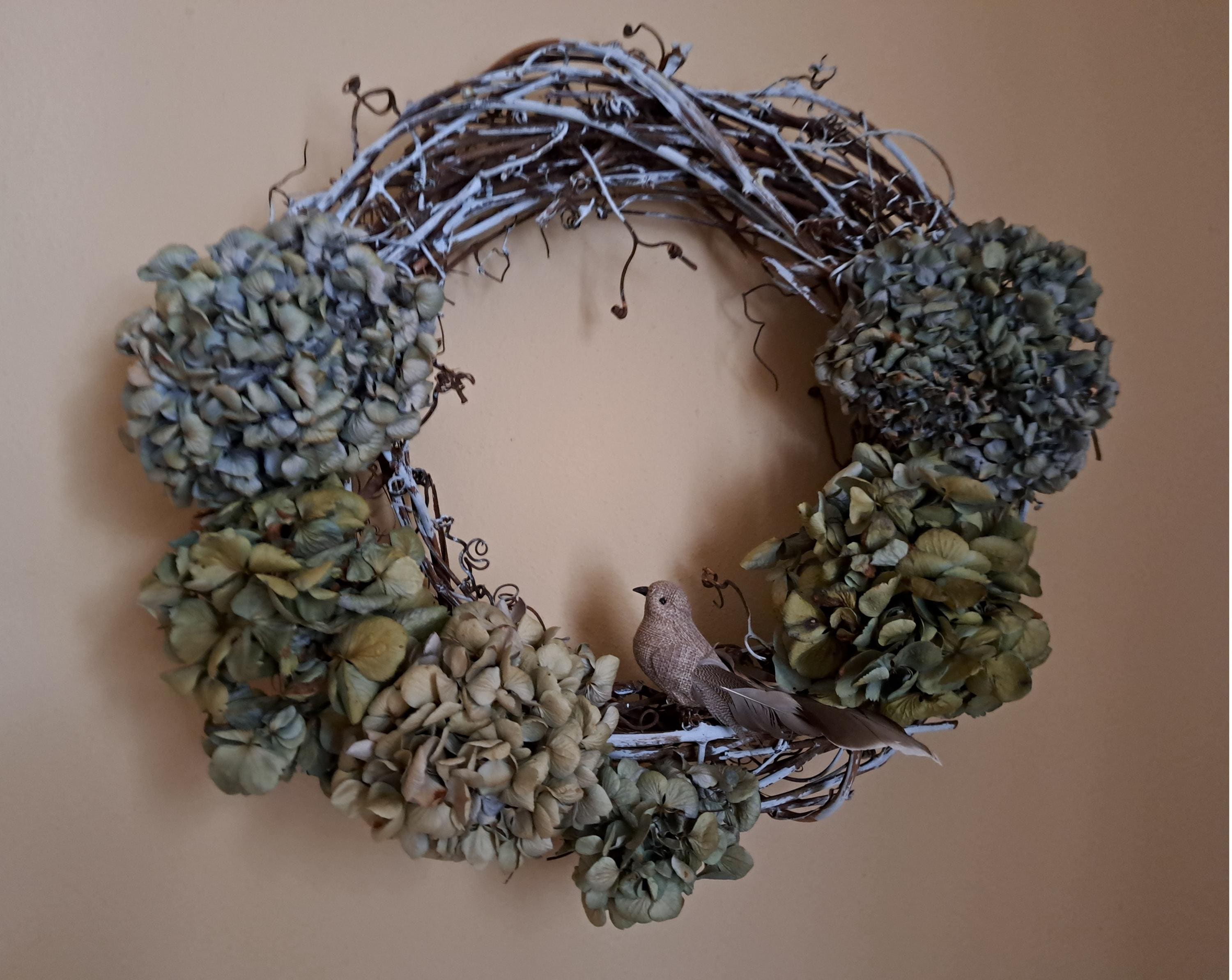 Unique Hand Made All Natural Blue Hydrangea Wreath with Bird